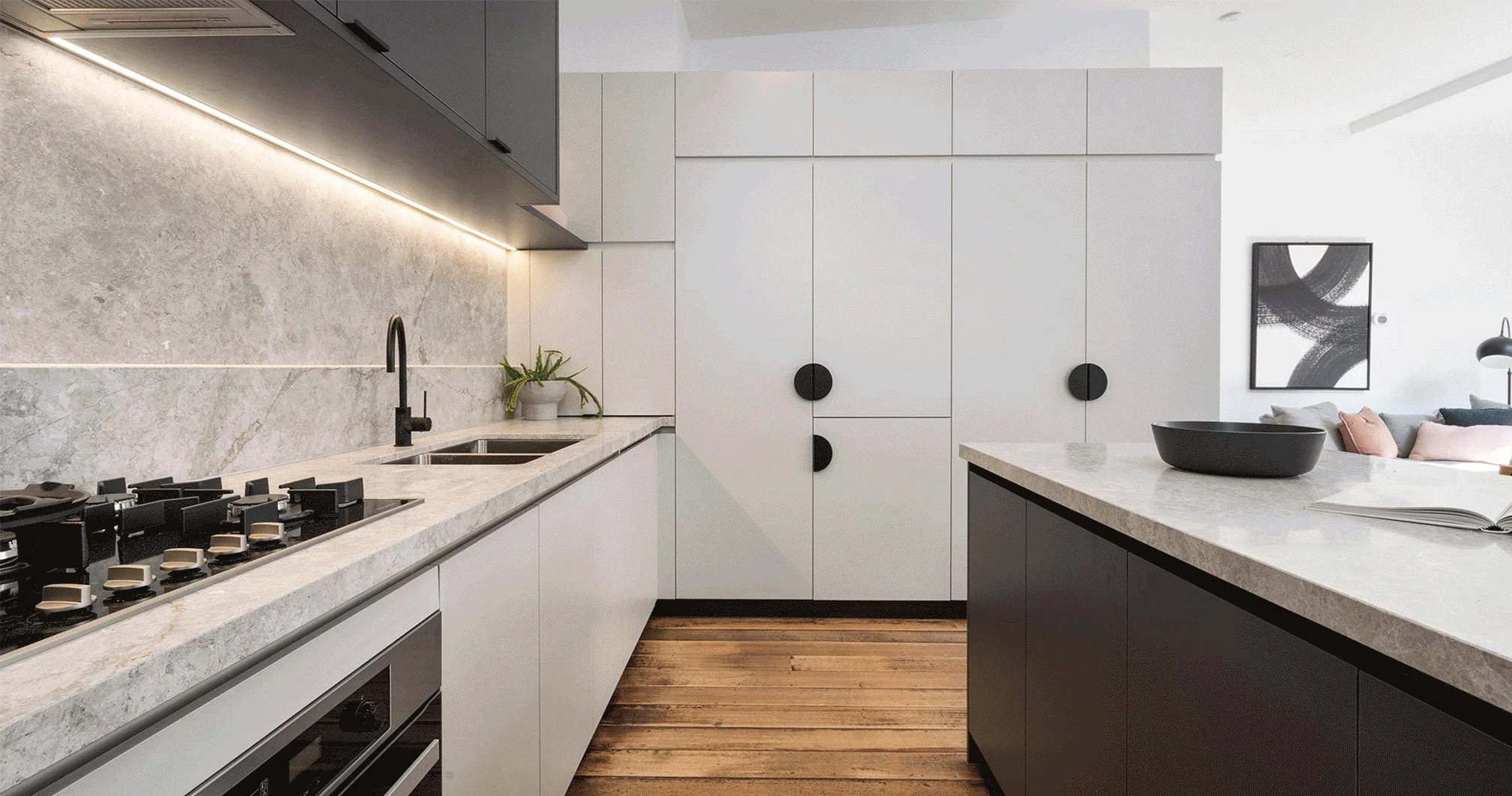 Living areas flow from kitchen to balcony, with smart storage and contemporary detailing throughout promoting a sense of calm and order.